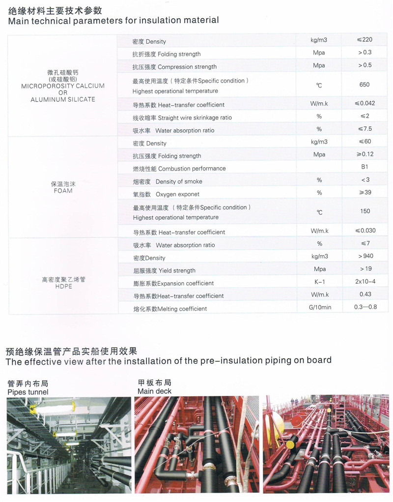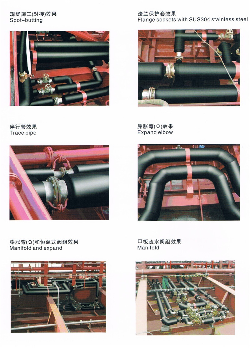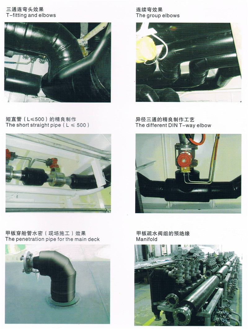 针对国际船舶配套产品的发展趋势和特点,研究开发了适用于油轮(船)、化学品船、硫磺船等船舶的某些管系(如:燃油输送、液货、甲板蒸汽、扫舱、清洗、热水系统和甲板疏水阀组等)进行预绝缘(隔热)管包扎,区别于传统的岩棉包扎的方法,该产品具有:美观大方、保温效果好、管系整体刚度强、整个管路水密效果佳、使用寿命长等显著优点。